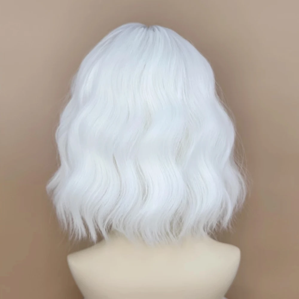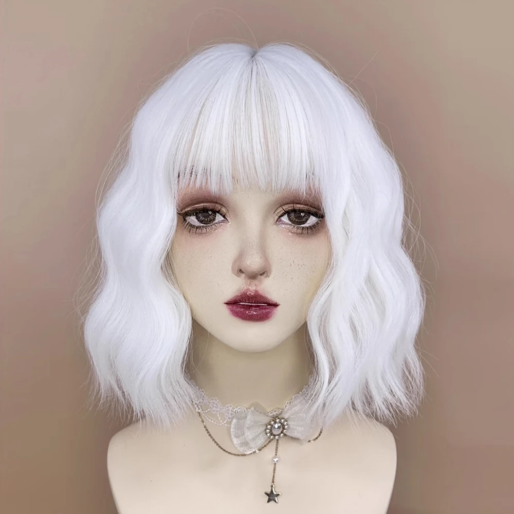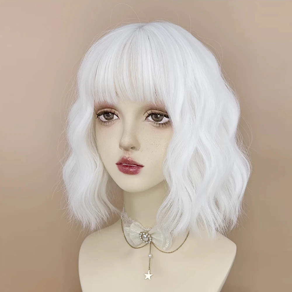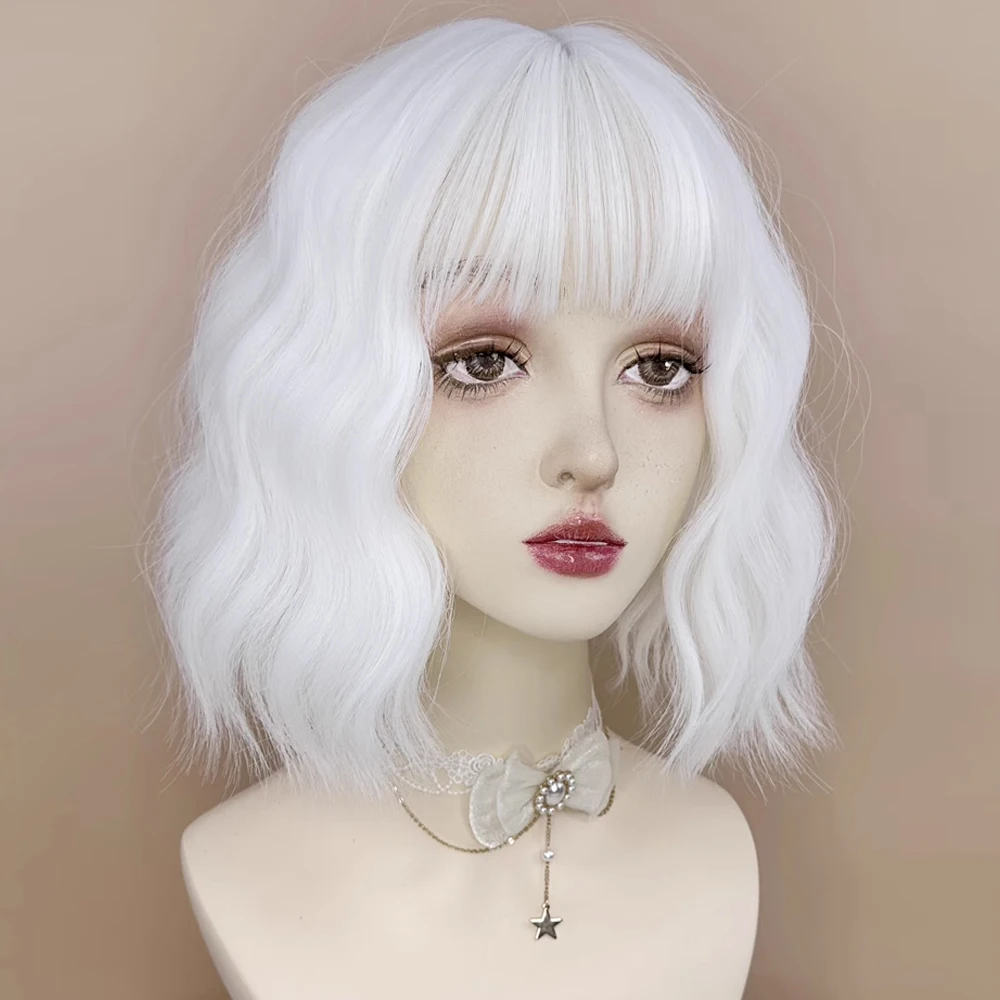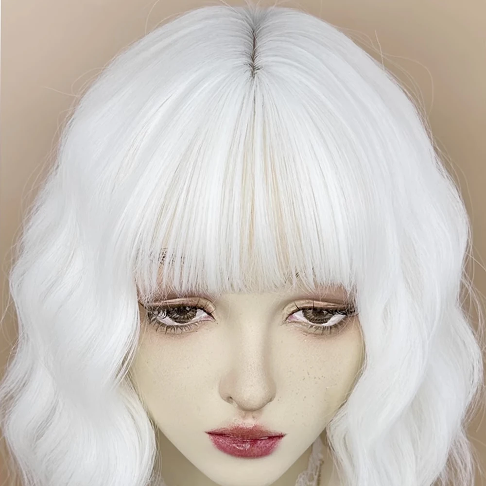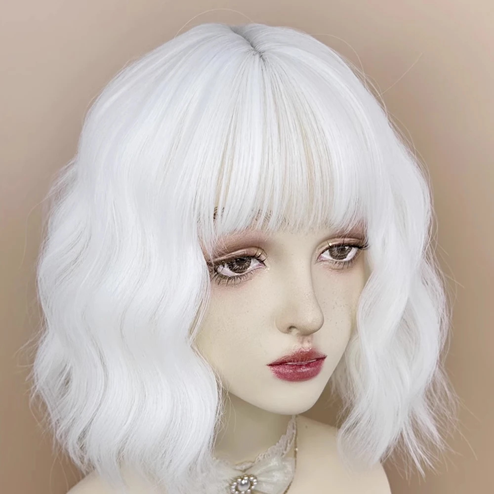 Perruque synthétique courte ondulée blanche bouclée avec frange pour femmes, perruque de Cosplay Lolita naturelle moelleuse pour fête quotidienne